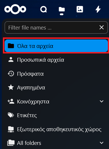 Επιλέγοντας Όλα τα αρχεία από το αριστερό μενού εμφανίζονται στη σελίδα όλα τα αρχεία που βρίσκονται στον χώρο μας στο MyCloud είτε τα έχουμε ανεβάσει εμείς είτε τα διαμοιράζονται άλλοι χρήστες μαζί μας. Αντίστοιχα, υπάρχουν κι επιλογές για εμφάνιση μόνο των πρόσφατα τροποποιημένων αρχείων, αρχείων στα “Αγαπημένα”, κοινόχρηστων αρχείων και αρχείων στα οποία έχουμε ορίσει κάποια ετικέτα.