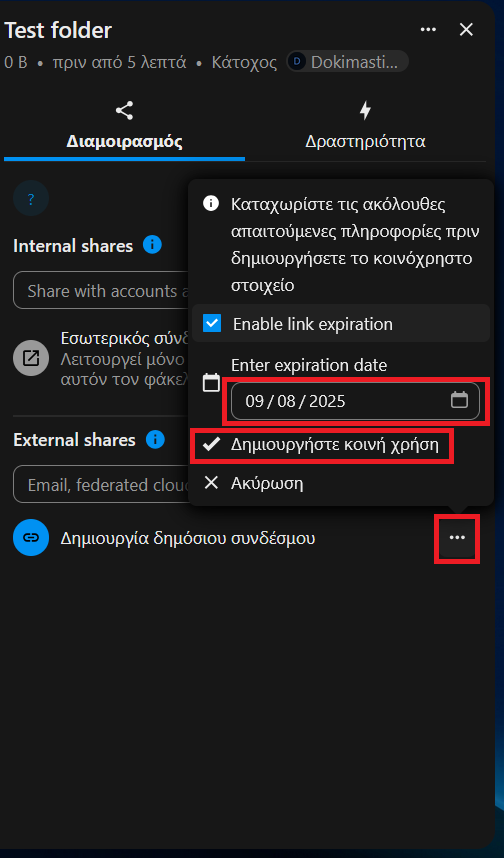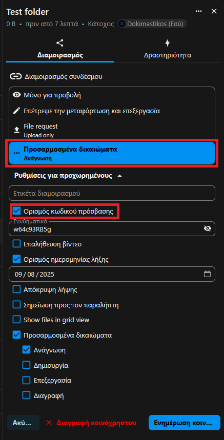 Επιλέγουμε ημερομηνία λήξης του συνδέσμου, τα δικαιώματα που θέλουμε να δώσουμε σε όποιον έχει τον σύνδεσμο (π.χ. μόνο για ανάγνωση, άδεια μεταφόρτωσης αρχείων κι επεξεργασίας, μόνο απόθεση αρχείου) Η λειτουργία απόθεσης αρχείου δεν επιτρέπει σε όποιον χρήστη ανεβάσει αρχεία στην ίδια τοποθεσία να βλέπει τα αρχεία που ανέβασαν άλλοι.