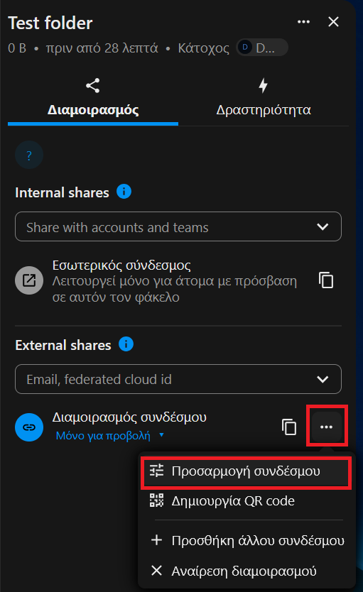 Η δυνατότητα διαμοιρασμού φακέλου/αρχείου με άτομα που δεν έχουν ιδρυματικό λογαριασμό δίνεται από ττις 3 τελείες (…) δίπλα από το Δημιουργία Δημόσιου Συνδέσμου. Πρόκειται να παραχθεί ένας σύνδεσμος, τον οποίο σε όποιους τον παραχωρήσουμε θα έχουν πρόσβαση σε μία τοποθεσία είτε για να δουν αρχεία που ανεβάσαμε είτε για να ανεβάσουν οι ίδιοι αρχεία χωρίς τη χρήση προσωπικού λογαριασμού.