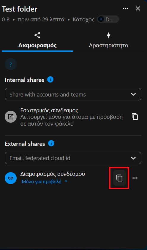 Αντιγράφουμε τον σύνδεσμο για τον φάκελο/αρχείο μέσω του κουμπιού που φαίνεται στην εικόνα και τον αποστέλλουμε μέσω email σε άτομα εκτός ΑΠΘ, στέλνοντάς τους και τον κωδικό προστασίας που ορίσαμε (αν πρόκειται για αρχεία με προσωπικά δεδομένα ή δεδομένα που θέλουμε να προστατευθούν, για λόγους ασφάλειας ο κωδικός προστασίας πρέπει να γνωστοποιείται με άλλο κανάλι επικοινωνίας π.χ. τηλεφωνικά, SMS κτλ).
