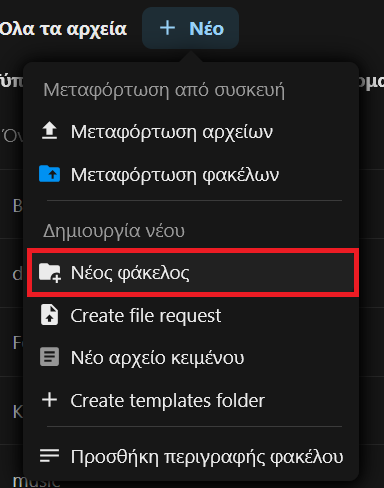 1. Για να οργανώσουμε τα αρχεία μας, μπορούμε να δημιουργήσουμε έναν φάκελο επιλέγοντας “+Νέο” και Νέος Φάκελος/New Folder.