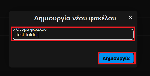 2. Πληκτρολογούμε το όνομα που επιθυμούμε να έχει ο φάκελος και επιλέγουμε το βέλος ή πατάμε Δημιουργία.