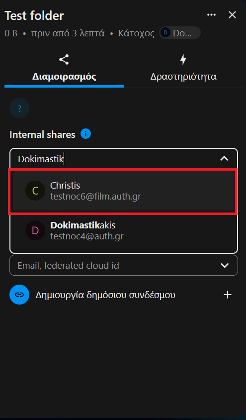 1. Επιλέγουμε το σύμβολο της κοινοποίησης δεξιά του φακέλου/αρχείου που επιθυμούμε να διαμοιραστούμε. Στα δεξιά εμφανίζεται το μενού των δυνατοτήτων κοινοποίησης. Πληκτρολογούμε το Όνομα Χρήστη/Username του χρήστη ΑΠΘ με τον οποίο επιθυμούμε να διαμοιραστούμε τον φάκελο/αρχείο. Κατά την πληκτρολόγηση από κάτω ακριβώς εμφανίζονται χρήστες του ΑΠΘ που ταιριάζει το username τους και επιλέγουμε αυτόν που μας ενδιαφέρει.