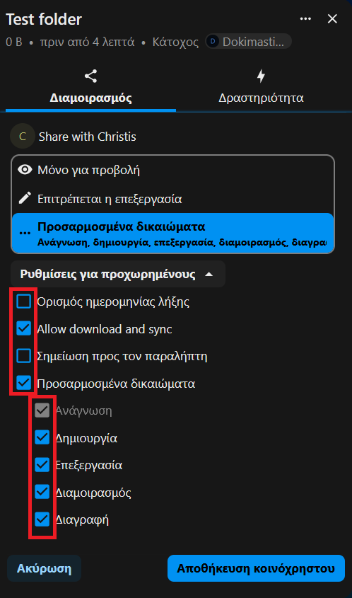 2. Από τις 3 τελείες (…) δίπλα στο όνομα του χρήστη μπορούμε να επεξεργαστούμε τα δικαιώματά του πάνω στον φάκελο ή στο αρχείο. Μαρκάρουμε την επιλογή Δυνατότητα επεξεργασίας για να μπορεί επεξεργαστεί τον φάκελο/αρχείο και την επιλογή Επιτρέπεται ο επαναδιαμοιρασμός εάν θέλουμε να δώσουμε στον χρήστη τη δυνατότητα να μπορεί και ο ίδιος να το διαμοιράσει. Αν θελήσουμε να αφαιρέσουμε τον χρήστη από τα άτομα που μπορούν να δουν τον φάκελο/αρχείο, επιλέγουμε Αναίρεση διαμοιρασμού.