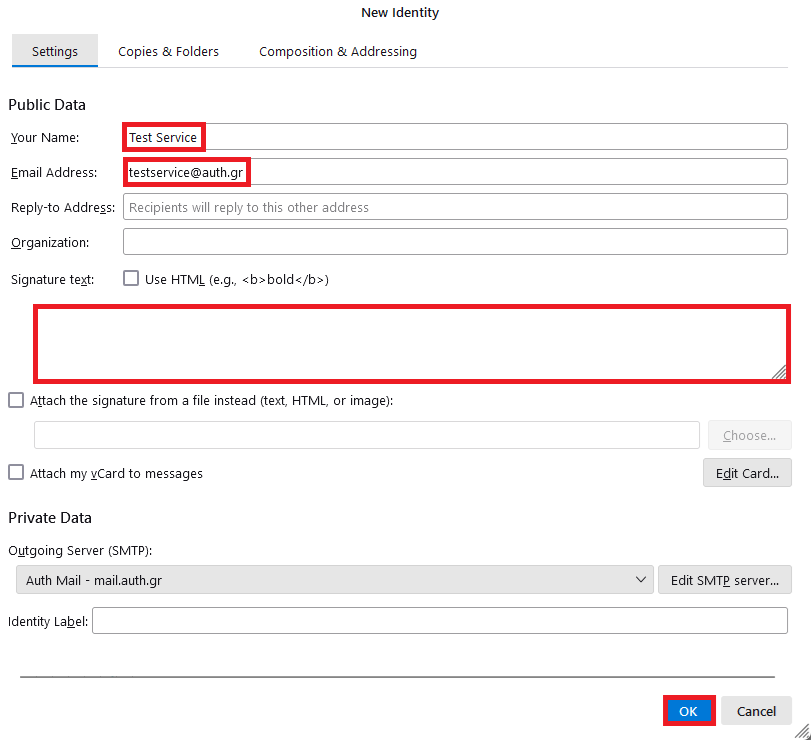 Στο πεδίο «Το Όνομά σας»/”Your Name” πληκτρολογούμε το όνομα που θέλουμε να βλέπουν οι παραλήπτες των μηνυμάτων μας και στο πεδίο «Διεύθυνση Email»/”Email Address” πληκτρολογούμε την ψευδοδιεύθυνση που θέλουμε να εμφανίζεται ως αποστολέας στα μηνύματά μας. Στο πεδίο «Κείμενο υπογραφής»/”Signature text” μπορούμε να εισάγουμε ένα κείμενο με το οποίο θα υπογράφονται τα μηνύματά μας, για παράδειγμα μια περιγραφή της υπηρεσίας μας. Πατάμε OK.