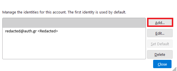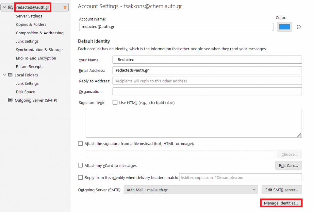 Επιλέγουμε τον λογαριασμό μας από το αριστερό μενού και πατάμε Διαχείριση Ταυτοτήτων / Manage Identities.