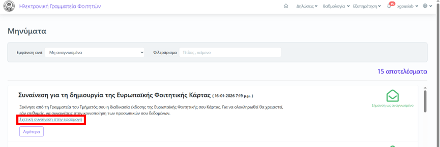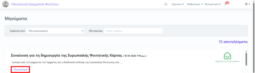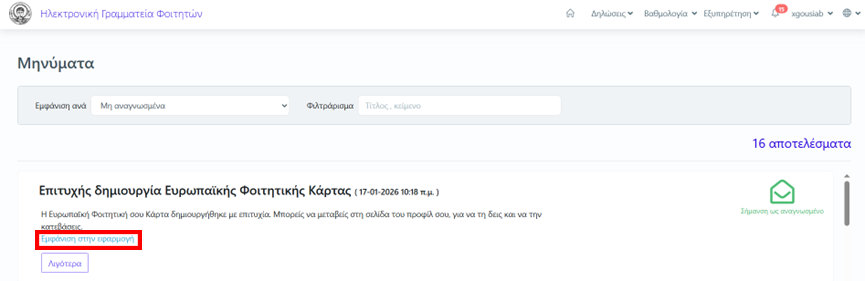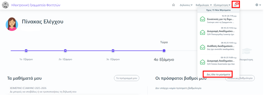2. Είτε να δούμε σχετική ειδοποίηση μέσα στο περιβάλλον students.auth.gr, επιλέγοντας στις Ειδοποιήσεις Δες όλα τα μηνύματα.