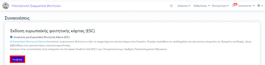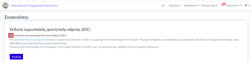 Αν συμφωνούμε με την αποστολή των στοιχείων μας που αναφέρονται στην υπηρεσία της ESC, επιλέγουμε το κουτάκι αριστερά της συναίνεσης και πατάμε Υποβολή. Σε περίπτωση που δε συμφωνούμε η κάρτα δε θα δημιουργηθεί.