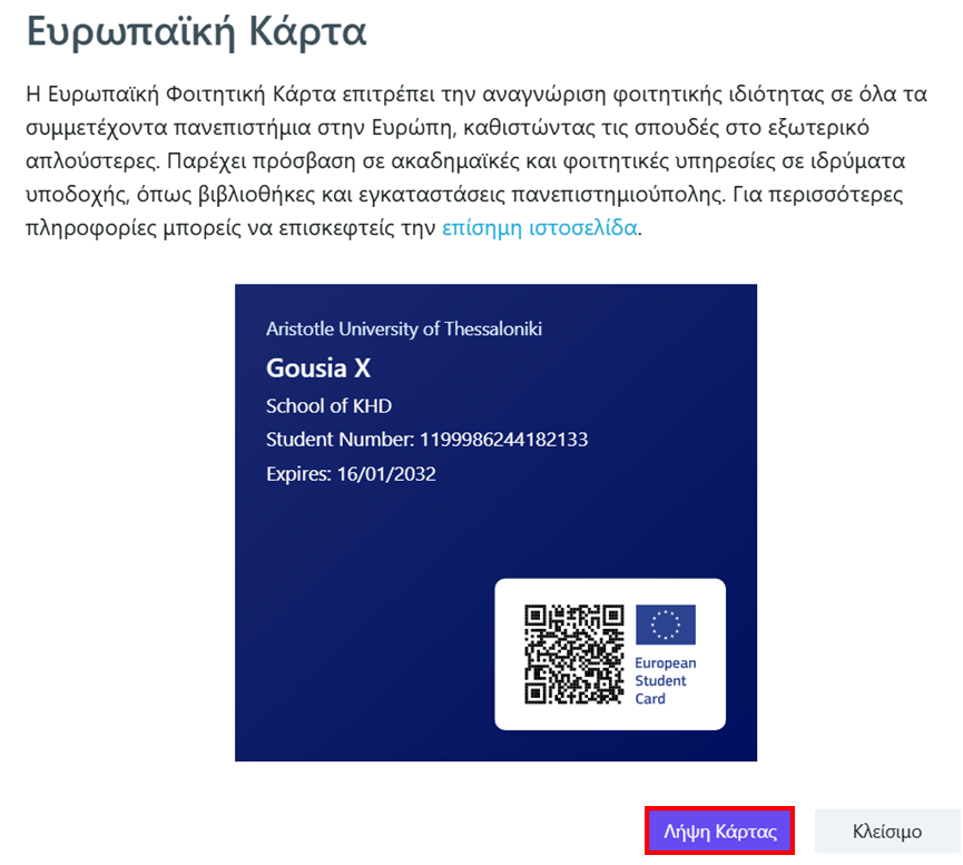 Πατώντας Λήψη Κάρτας μπορούμε να αποθηκεύσουμε τοπικά την Ευρωπαϊκή Φοιτητική Κάρτα. Το όνομα του αρχείου που θα κατεβάσουμε είναι EuropeanStudentCard.webp και μπορούμε να το εμφανίζουμε χωρίς να χρειάζεται σύνδεση με την εφαρμογή students.auth.gr. Σε περιπτώσεις που ζητείται η αναγνώριση της φοιτητικής μας ιδιότητας σε ιδρύματα του εξωτερικού, ο έλεγχος γίνεται με σκανάρισμα του QR code που περιέχει η κάρτα.