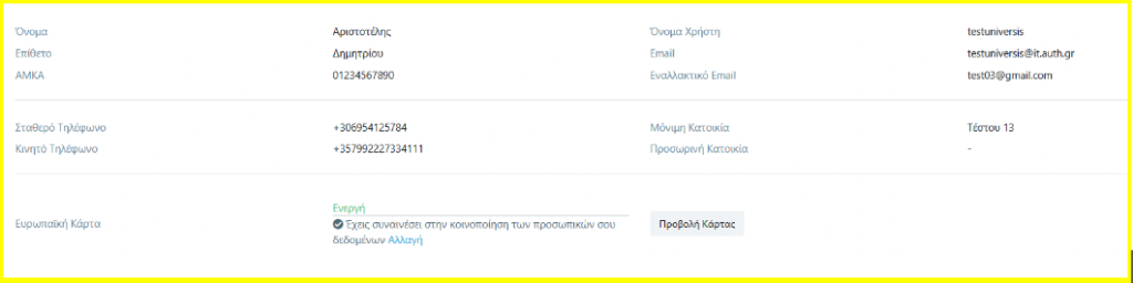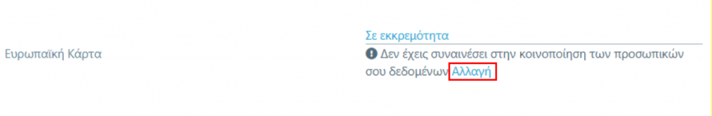 3. Είτε να φτάσουμε στην παραπάνω σελίδα της συναίνεσης επιλέγοντας από το μενού επάνω δεξιά το Προφίλ μας. Εκεί στο κάτω μέρος, μετά τα προσωπικά μας στοιχεία, θα δούμε την ενότητα για την Ευρωπαϊκή Φοιτητική Κάρτα με την ένδειξη “Σε εκκρεμότητα”. Επιλέγοντας Αλλαγή μπορούμε να προχωρήσουμε στη συναίνεση.