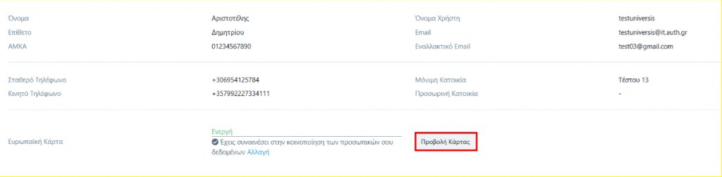 Επιλέγοντας τον σύνδεσμο Εμφάνιση στην εφαρμογή μεταβαίνουμε στο προφίλ μας, όπου μπορούμε να δούμε και να κατεβάσουμε την κάρτα μας επιλέγοντας Προβολή Κάρτας.