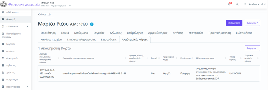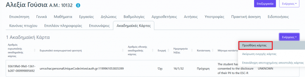 Αν ο φοιτητής ακυρώσει τη συναίνεσή του και επιθυμεί έκδοση νέας κάρτας, επικοινωνεί με τη Γραμματεία του Τμήματός του. Στη συνέχεια, θα πρέπει να μεταβούμε στο προφίλ του και από την Ενότητα Ακαδημαϊκές Κάρτες να επιλέξουμε Προσθήκη Κάρτας.