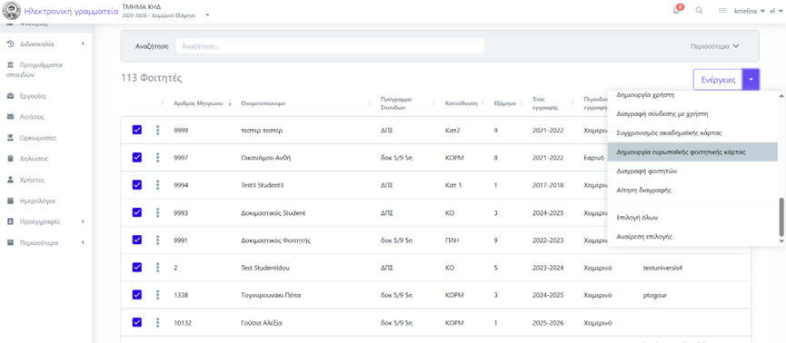 Από τις Ενέργειες επιλέγουμε τη Δημιουργία Ευρωπαϊκής Φοιτητικής κάρτας.