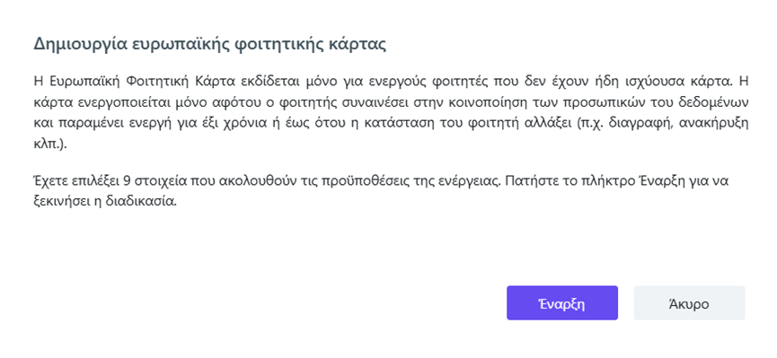 Επιλέγοντας την Έναρξη ξεκινάει η διαδικασία προσθήκης κάρτας σε κάθε ενεργό φοιτητή. Η διάρκεια ισχύος της κάρτας είναι 6 χρόνια από τη δημιουργία της. Σε περίπτωση που ο φοιτητής/ φοιτήτρια διαγραφεί ή ορκιστεί η κάρτα απενεργοποιείται αυτόματα.
