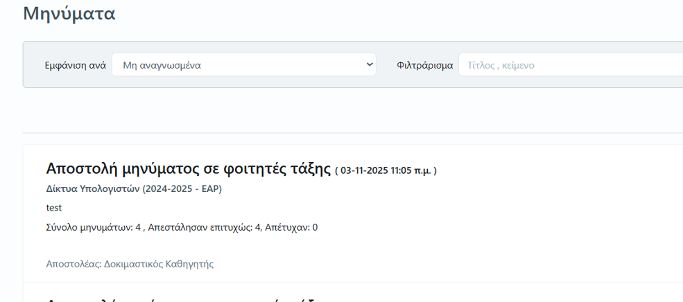 Στην Ηλεκτρονική Γραμματεία Διδασκόντων υπάρχει πλέον η δυνατότητα κάθε διδάσκοντας να επικοινωνήσει μέσω αποστολής μηνύματος με τους φοιτητές που έχουν δηλώσει το συγκεκριμένο μάθημα.