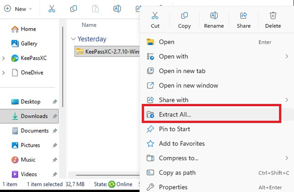 - Μεταβαίνουμε στις Λήψεις, κάνουμε δεξί κλικ στο αρχείο KeePassXC, και κλικ στην εξαγωγή (extract all).
