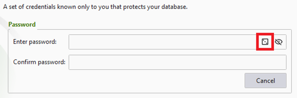 4. Στο παράθυρο Database Credentials εισάγουμε έναν ισχυρό κωδικό πρόσβασης που επιθυμούμε ή δημιουργούμε ένα τυχαίο ισχυρό κωδικό κάνοντας κλικ στο εικονίδιο με το ζάρι.