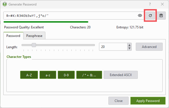 5. Στο παράθυρο Generate Password, κάνοντας κλικ στο εικονίδιο με το βέλος, παράγονται τυχαίοι κωδικοί με βάση τις επιλογές που έχουμε κάνει ως προς το μήκος και τον τύπο των συμβόλων που θέλουμε να περιέχει ο κωδικός. Έπειτα, πατάμε Apply Password.