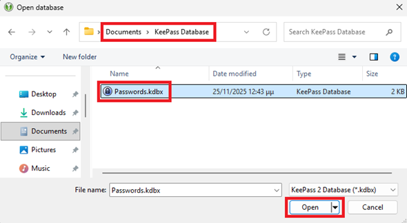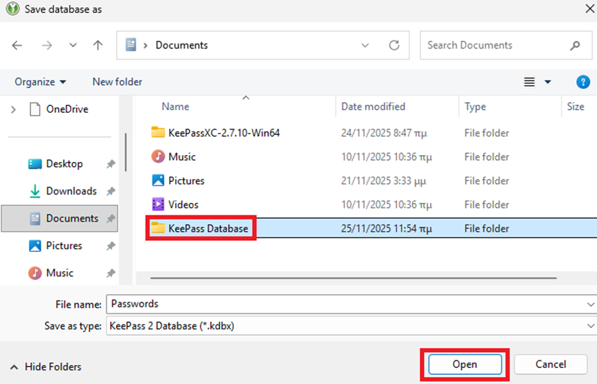 8. Δίνουμε ένα όνομα στον νέο φάκελο (π.χ. KeePass Database) και κάνουμε κλικ στο Open.