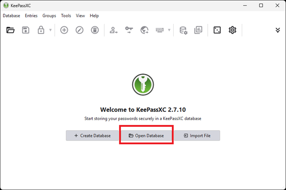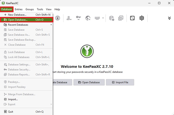 1. Ανοίγουμε την εφαρμογή KeePassXC και στην αρχική οθόνη επιλέγουμε Open Database ή κάνουμε κλικ στο Database και επιλέγουμε Open Database.