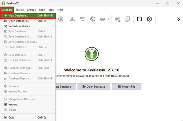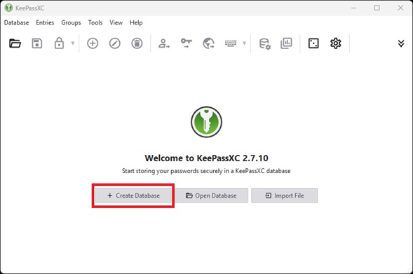 - Ανοίγουμε την εφαρμογή KeePassXC κι επιλέγουμε Create Database ή κάνουμε κλικ στο Database και επιλέγουμε New Database.