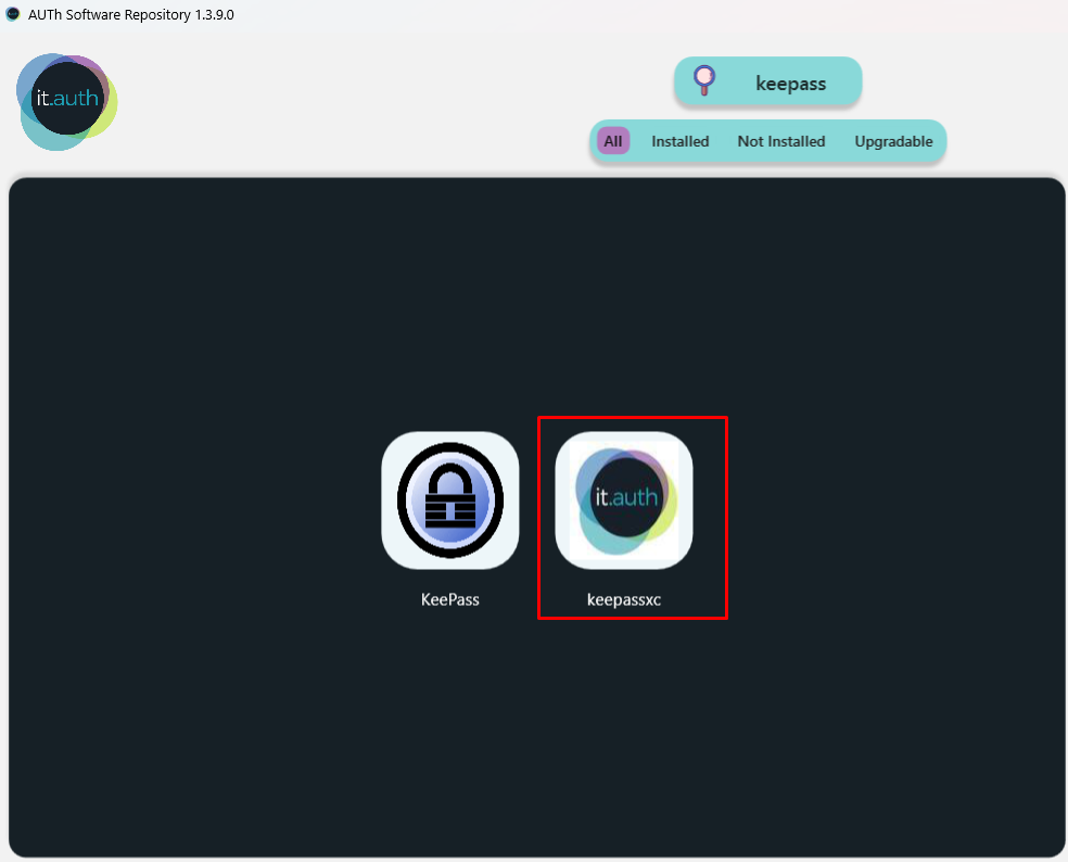 Μεταβαίνουμε στο AUTh Software Repository, αναζητούμε την εφαρμογή KeePassXC και πατάμε Install.