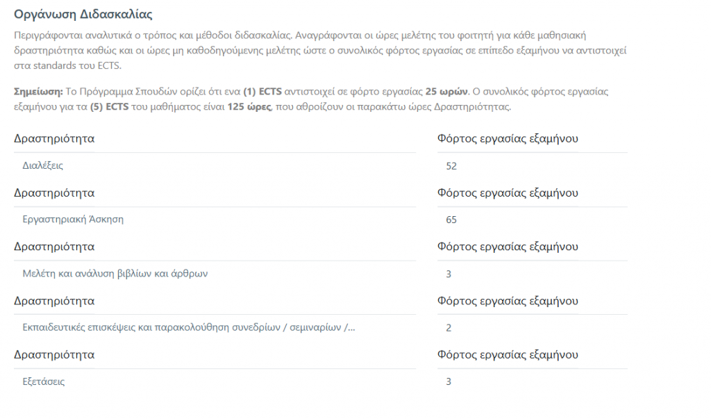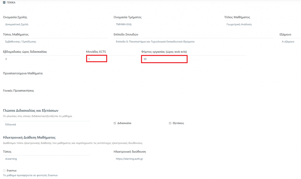 Οι εβδομαδιαίες ώρες διδασκαλίας συμπληρώνονται από την Γραμματεία, με την δημιουργία του μαθήματος στην συγκεκριμένη περίοδο. Αν δεν βλέπουμε τις σωστές ώρες, απευθυνόμαστε στην Γραμματεία μας προς διόρθωση. Οι μονάδες ECTS του μαθήματος, συμπληρώνονται επίσης από την Γραμματεία, χωρίς δυνατότητα τροποποίησης από εμάς.
