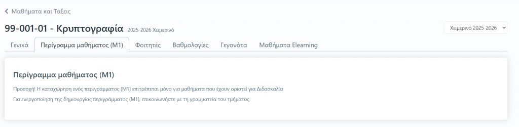 Εάν το μάθημα μας στην τρέχουσα περίοδο προσφέρεται μόνο για Εξέταση, δεν θα έχουμε τη δυνατότητα καταχώρησης περιγράμματος. Πιο συγκεκριμένα θα εμφανίζεται και σχετικό μήνυμα, το οποίο θα μας λέει: Προσοχή! Η καταχώρηση ενός περιγράμματος (Μ1) επιτρέπεται μόνο για μαθήματα που έχουν οριστεί για Διδασκαλία