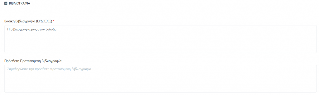 Στην ενότητα αυτή καταχωρούμε την βασική Βιβλιογραφία όπως ακριβώς καταχωρείται και στον Εύδοξο. Έχουμε επίσης την δυνατότητα καταχώρησης και Πρόσθετης προτεινόμενης βιβλιογραφίας.