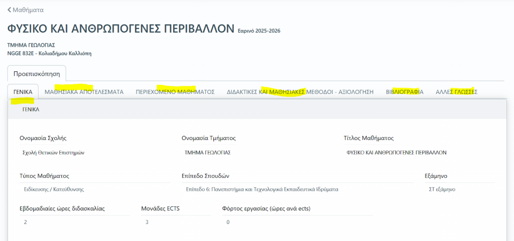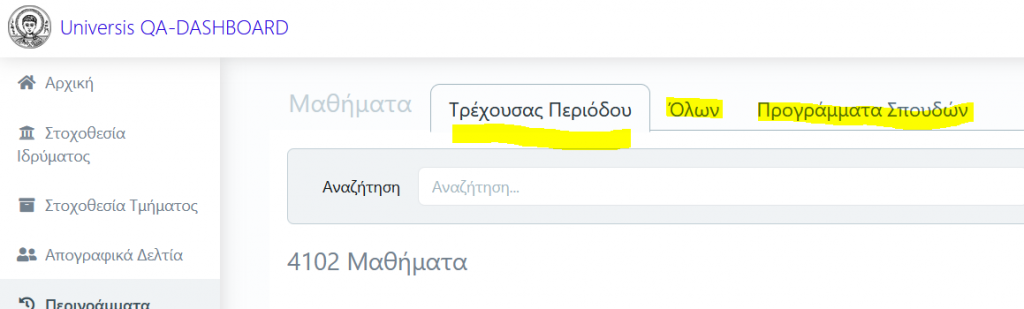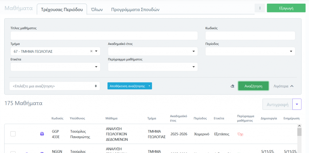 ΠΡΟΣΟΧΗ: ως “Τρέχουσα Περίοδος” είναι αυτή που έχει ορίσει η Γραμματεία του Τμήματος να είναι η τρέχουσα τη συγκεκριμένη χρονική στιγμή για το συγκεκριμένο Τμήμα (προπτυχιακό, μεταπτυχιακό, διδακτορικό). Άρα η αναζήτηση στην καρτέλα “Τρέχουσα Περίοδος” εφαρμόζει ένα φίλτρο για συγκεκριμένο έτος και περίοδο, αλλά όχι απαραίτητα αυτό που εμείς θεωρούμε το ημερολογιακό. Αν θέλετε να αποφύγετε λάθη λόγω παράλειψης ενημέρωσης του συστήματος Γραμματειών, χρησιμοποιήστε την καρτέλα “Όλων”.