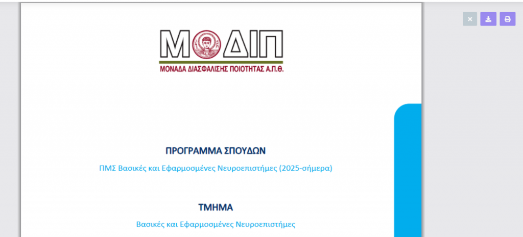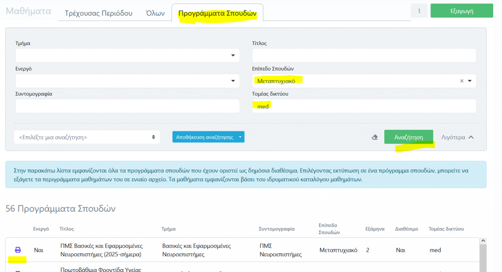 Με την τρίτη επιλογή “Προγράμματα Σπουδών” από τις καρτέλες (tabs) στο πάνω μέρος της σελίδας μπορεί να αναζητήσει κανείς όλα τα προγράμματα σπουδών με τις επιλογές φίλτρων. Για παράδειγμα Επίπεδο Σπουδών Μεταπτυχιακό και Τομέας Δικτύου med για όλα τα ΠΜΣ του Τμήματος Ιατρικής. Υπόψη ότι το φίλτρο “Τμήμα” με επιλογή “Ιατρικής” αφορά μόνο το ΠΠΣ του Τμήματος Ιατρικής και όχι όλα τα προγράμματα σπουδών του Ακαδημαϊκού Τμήματος, που φιλτράρονται καλύτερα με την επιλογή “Τομέας δικτύου” και τη συντομογραφία του email domain του Τμήματος (bio, geo, phed κλπ).