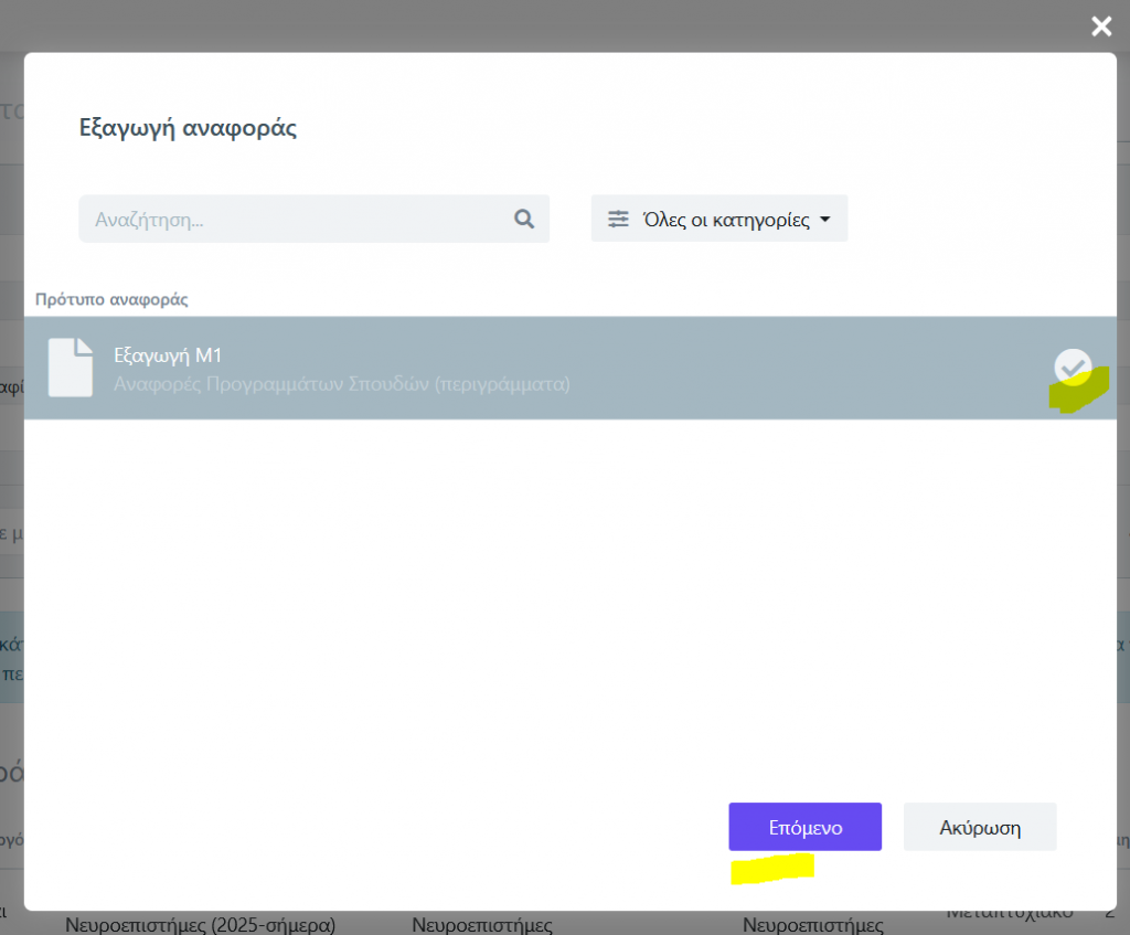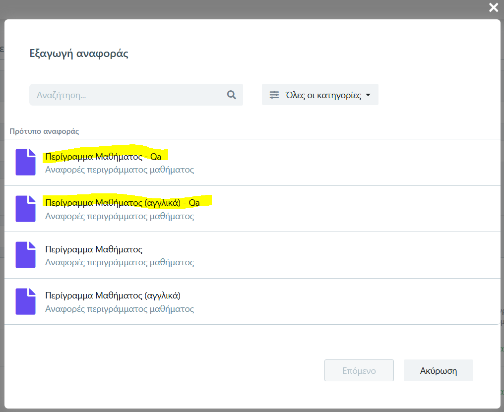 Από τη λίστα με τα αποτελέσματα της αναζήτησης μπορούμε να επιλέξουμε το εικονίδιο του εκτυπωτή και να παράξουμε αρχείο PDF ή Word docx που περιέχει όλα τα Μ1 των μαθημάτων αυτού του προγράμματος σπουδών για συγκεκριμένο ακαδημαϊκό έτος. Πρώτο βήμα είναι η επιλογή του προτύπου αναφοράς (μόνο ένα προς το παρόν).