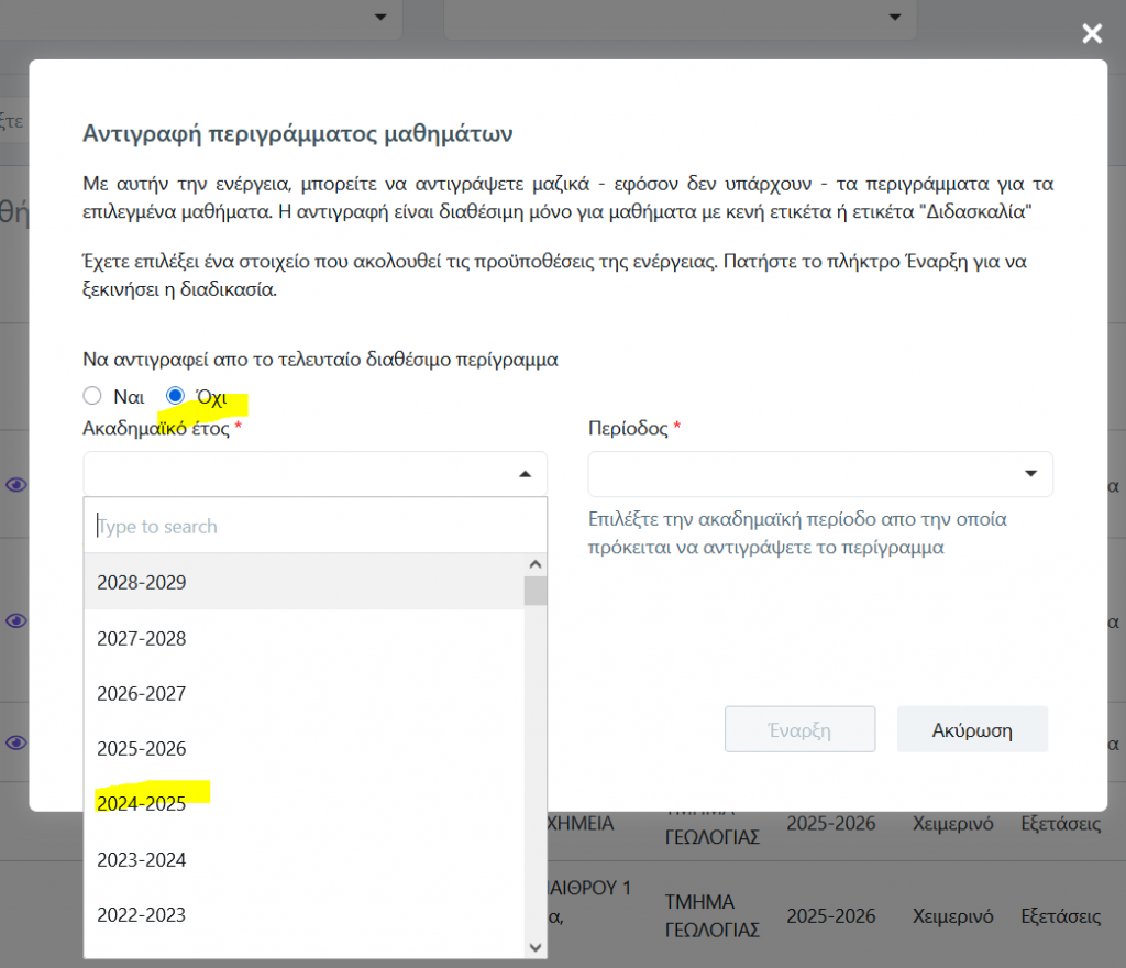 Αν δεν το θέλουμε αυτό και προτιμούμε να αντιγραφούν περιγράμματα από συγκεκριμένο έτος και περίοδο, επιλέγουμε Όχι και εμφανίζονται επιπλέον επιλογές.