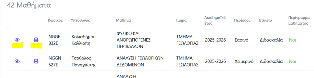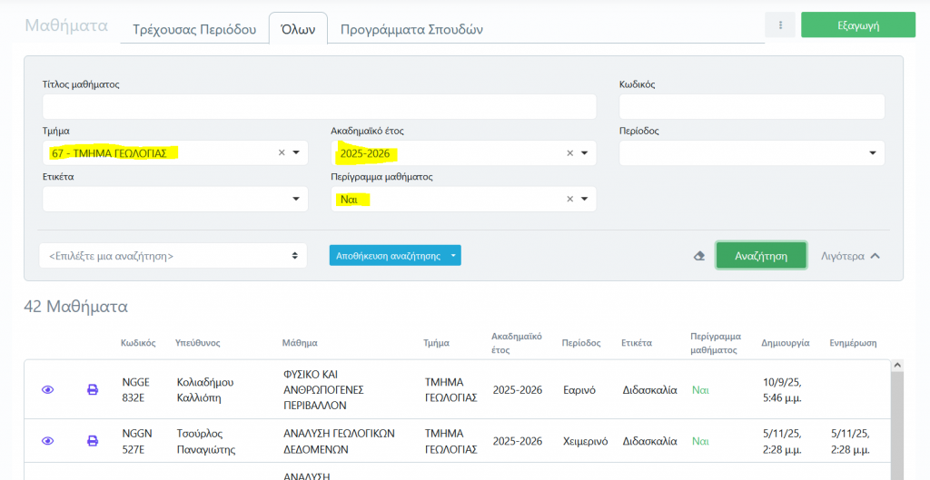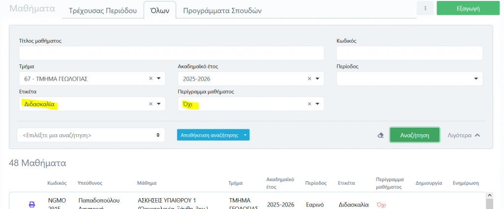 Πρώτα φιλτράρουμε τα μαθήματα που επιθυμούμε να αποκτήσουν Περίγραμμα Μ1 εφόσον δεν έχουν. Για παράδειγμα όλα τα μαθήματα του Τμήματος Γεωλογίας στην τρέχουσα περίοδο.