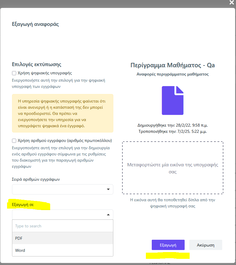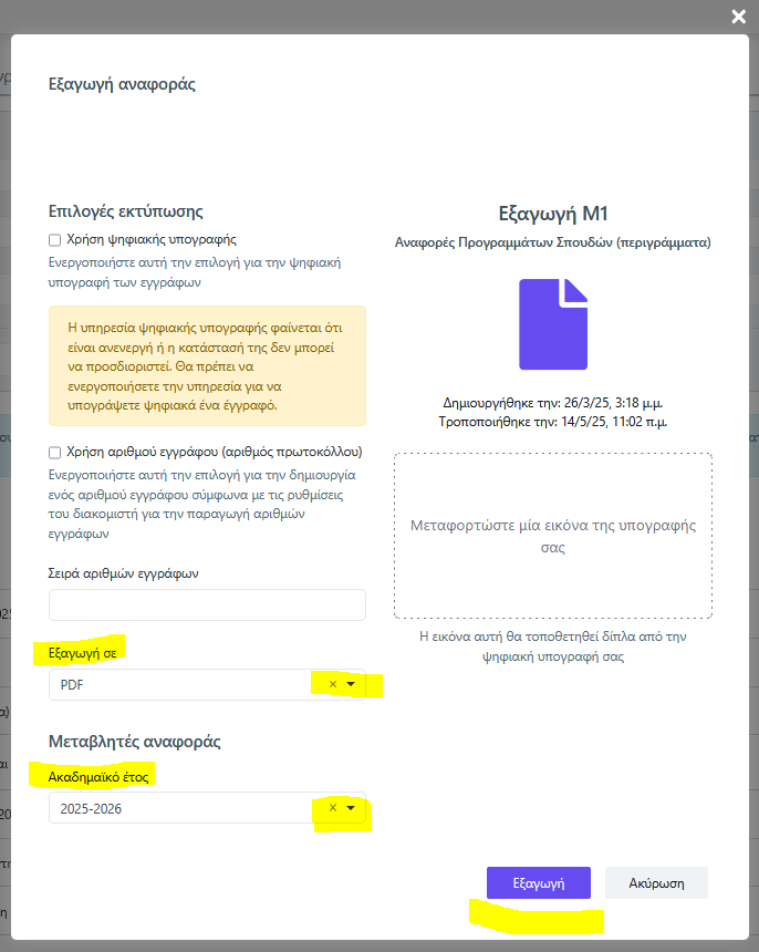 και στο επόμενο βήμα η επιλογή της Εξαγωγής σε PDF ή Word docx και του Ακαδημαϊκού έτους.