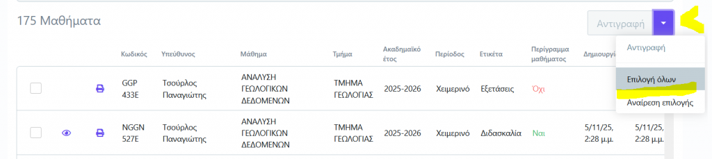 Επιλέγουμε όλα τα μαθήματα από τη λίστα με την ενέργεια Επιλογή όλων.