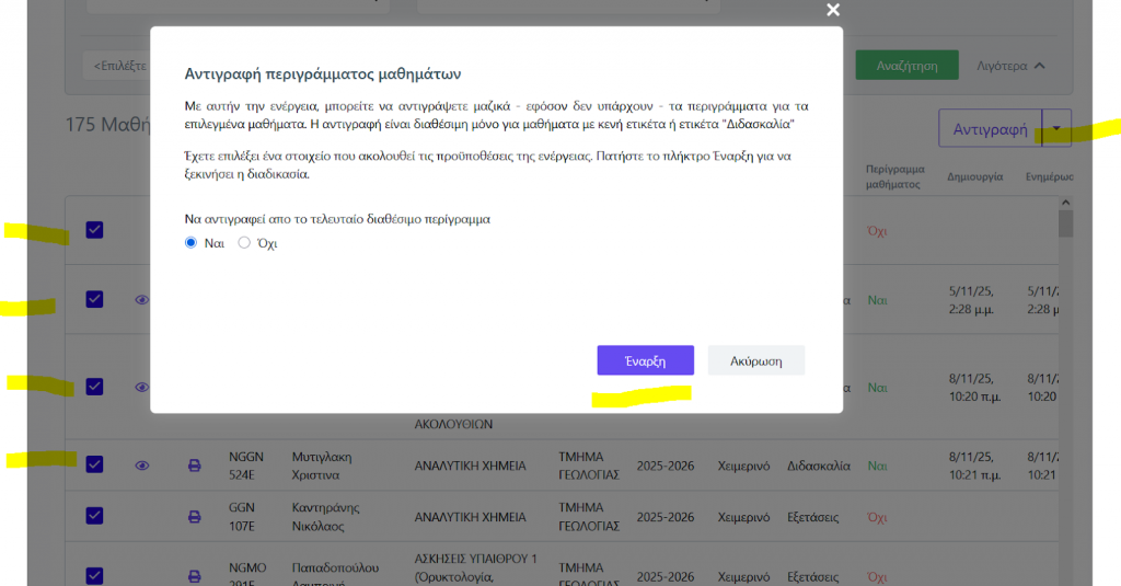 Θα επιλεγούν όλα τα μαθήματα στα αποτελέσματα της λίστας μας και θα επιλέξουμε την ενέργεια Αντιγραφή για να μπορέσουμε από το αναδυόμενο παράθυρο να κάνουμε Έναρξη της διαδικασίας.