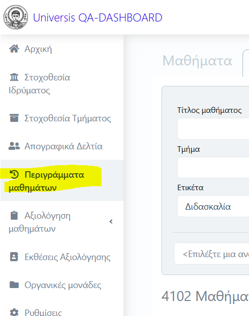 Μέσα στο περιβάλλον qdata.auth.gr επιλέγουμε από το αριστερό μενού τα Περιγράμματα Μαθημάτων για να αναζητήσουμε τάξεις, μαθήματα και περιγράμματα.