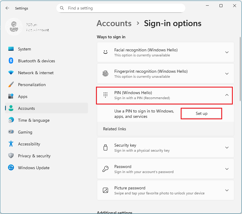 2. Στη συνέχεια επιλέγουμε ΡΙΝ (Windows Hello) και Set up